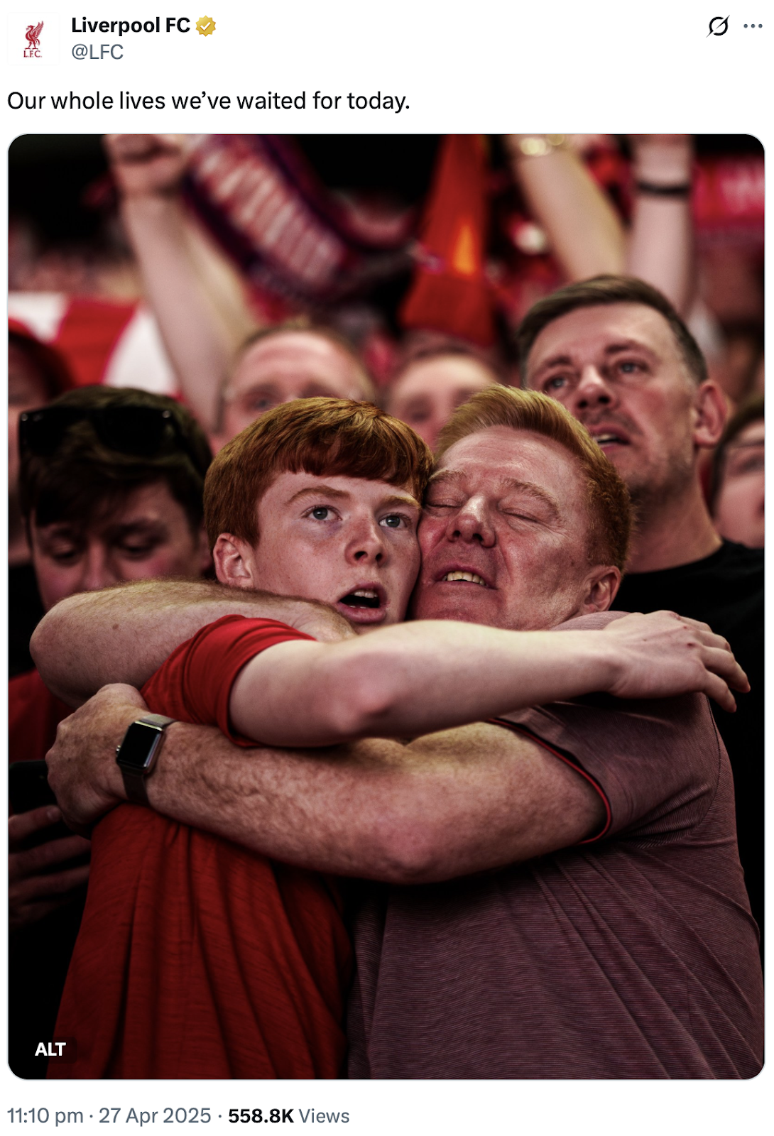 Moments later, as players and supporters chanted “You’ll Never Walk Alone” together, somewhere on Anfield, a father was hugging his son. On the father’s face you can see the relief, for finally having the chance to celebrate this moment with his son. But there is pain too: the memory of Hillsborough. Gerrard’s slip. The best friend who’s no longer there.